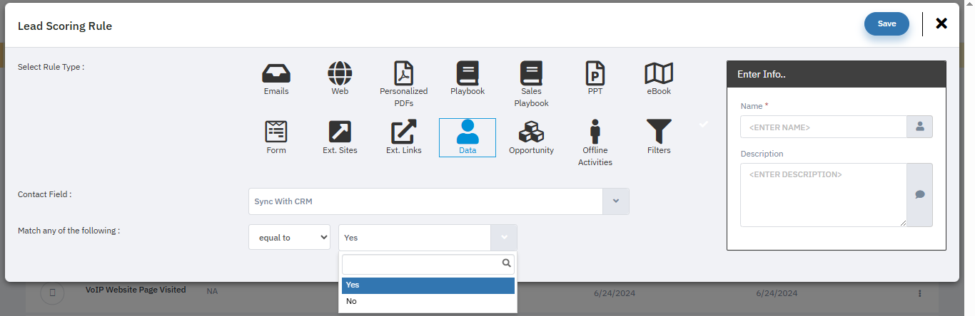 The CRM Sync condition is now available in Contact Scoring Rules under the Data option.