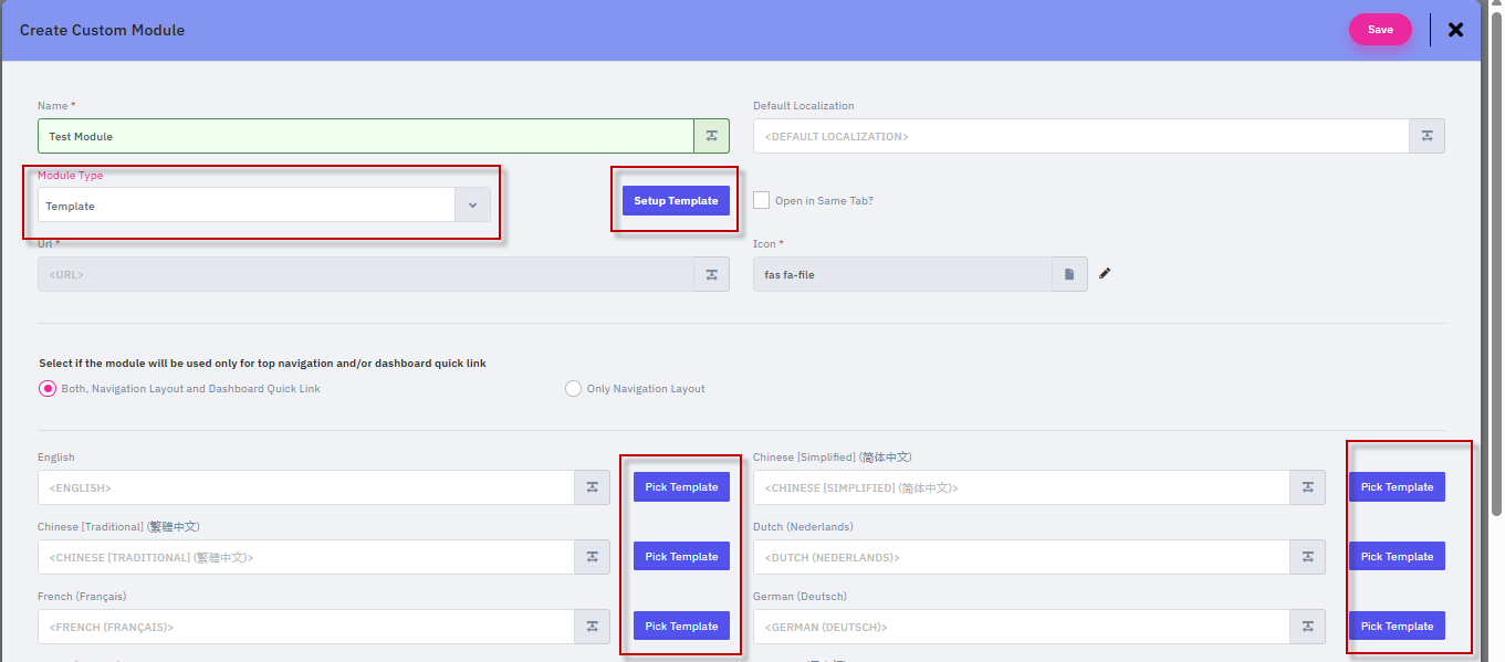 A new enhancement has been added to the Navigation Layout configuration that introduces language-specific template selection when creating or editing modules, enabling fully localized user experiences across multilingual environments.