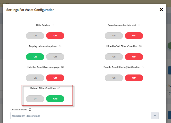 You can customize the Filters dropdown settings on the Assets Library page to meet specific organizational requirements. This ensures users can quickly locate and view relevant assets based on predefined filter conditions.