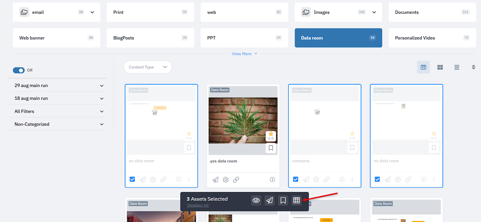 Selected assets are automatically added to the chosen Dataroom template