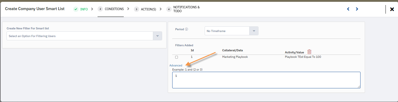6. If you click on the Advanced tab, you will see that one filter has been selected. The Advanced tab allows you to further refine the filters by adding AND or OR conditions. This helps you customize the logic between multiple filters and control how the data is included in the final results.