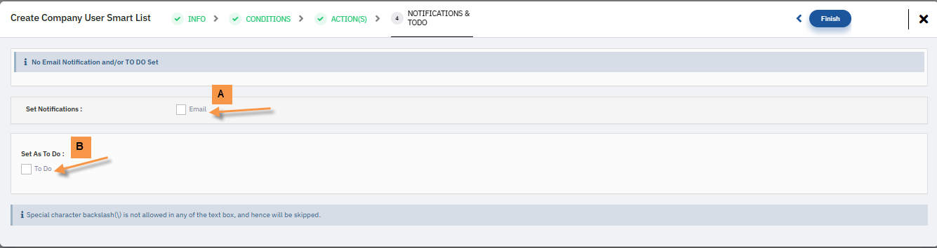 8. Click next and If you wish to receive email and/or dashboard notifications when the list receives new entries, click on email and/or notification check boxes respectively. Otherwise, click "Finish".
