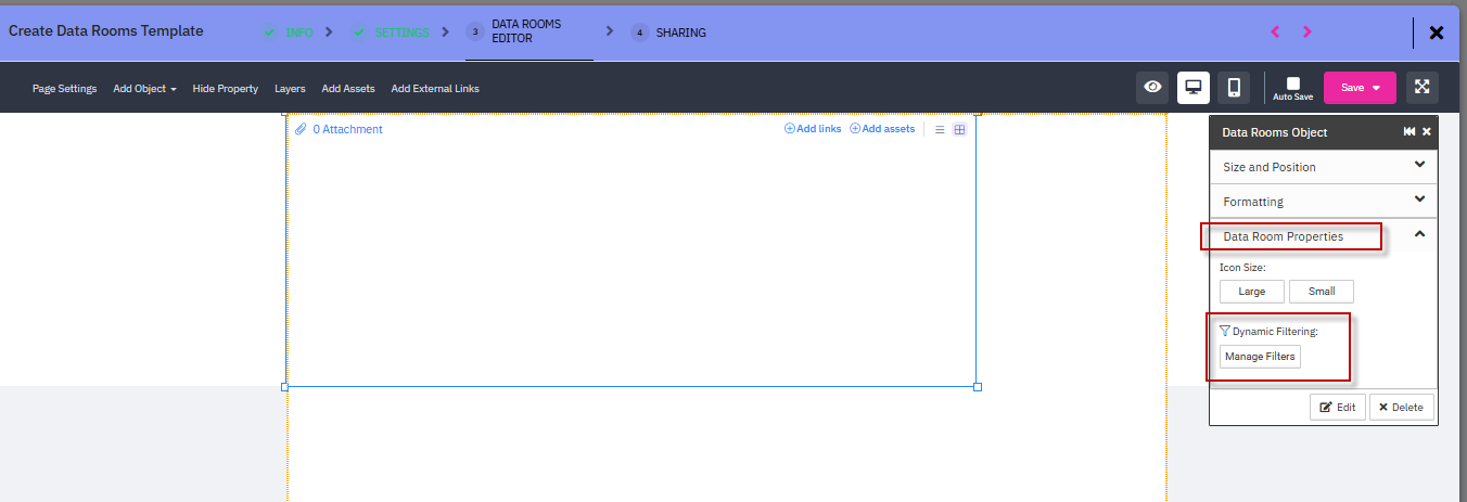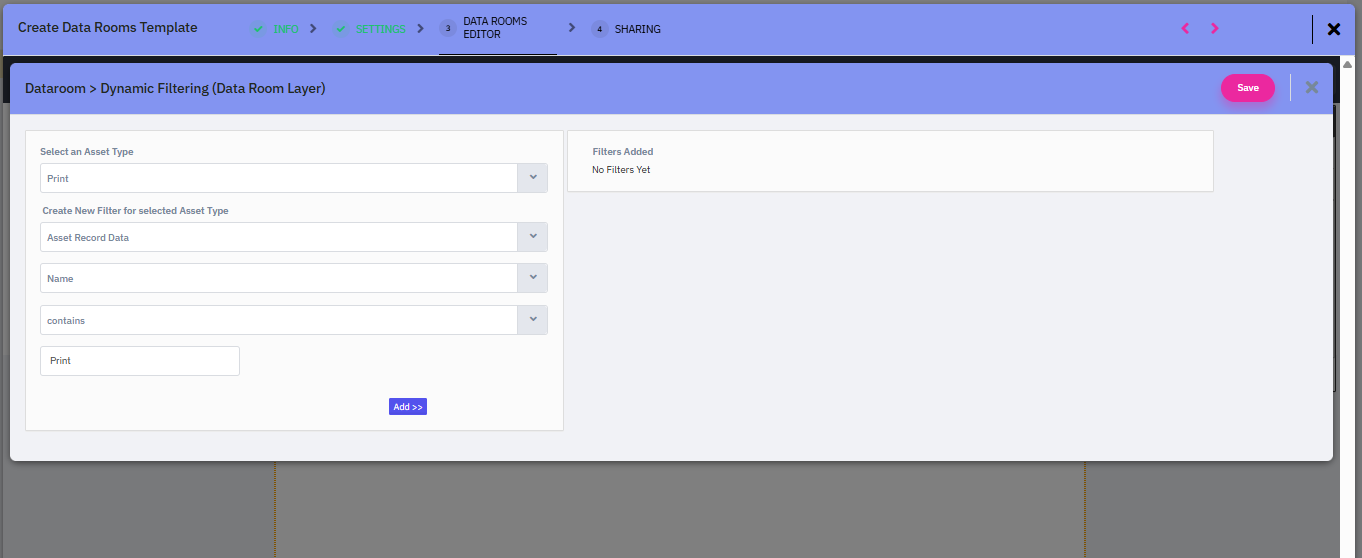 By selecting Data Filtering, you can define conditions to filter the assets that should appear in the Data Room.