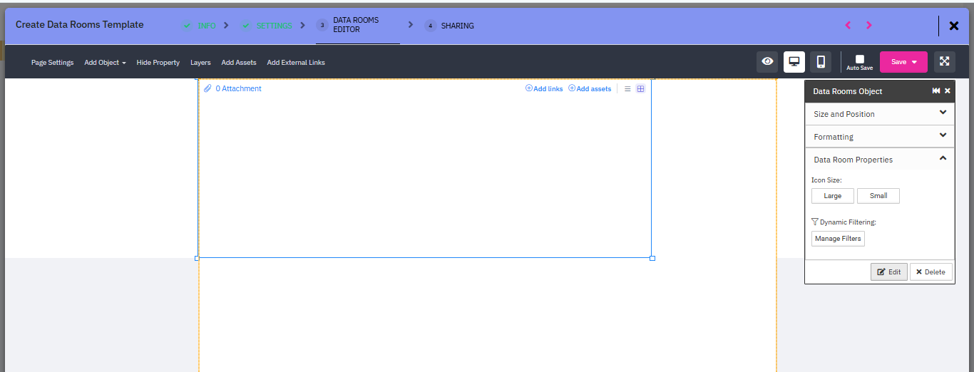 This will open up the “Dataroom Editor” option. The top bar will contain the tools needed to edit the template.