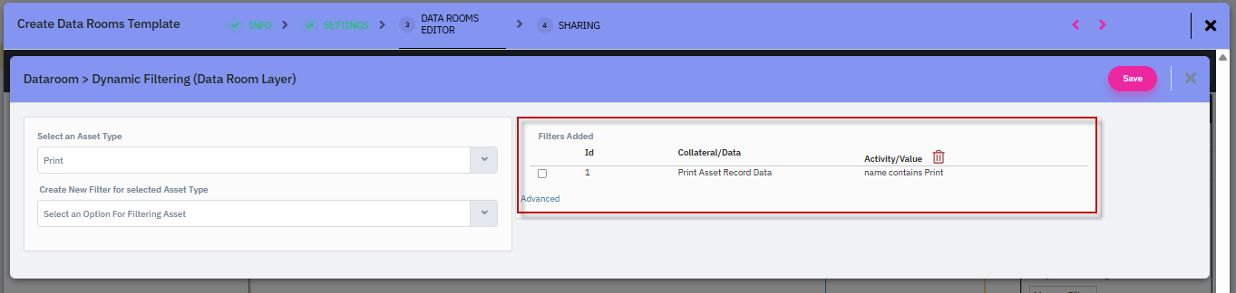While configuring a Data Room template, a new option called Data Filtering is available under Data Room Properties.