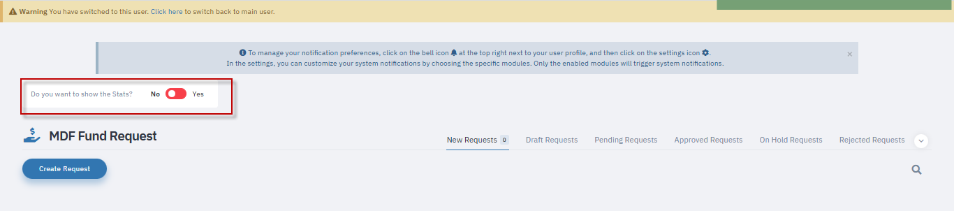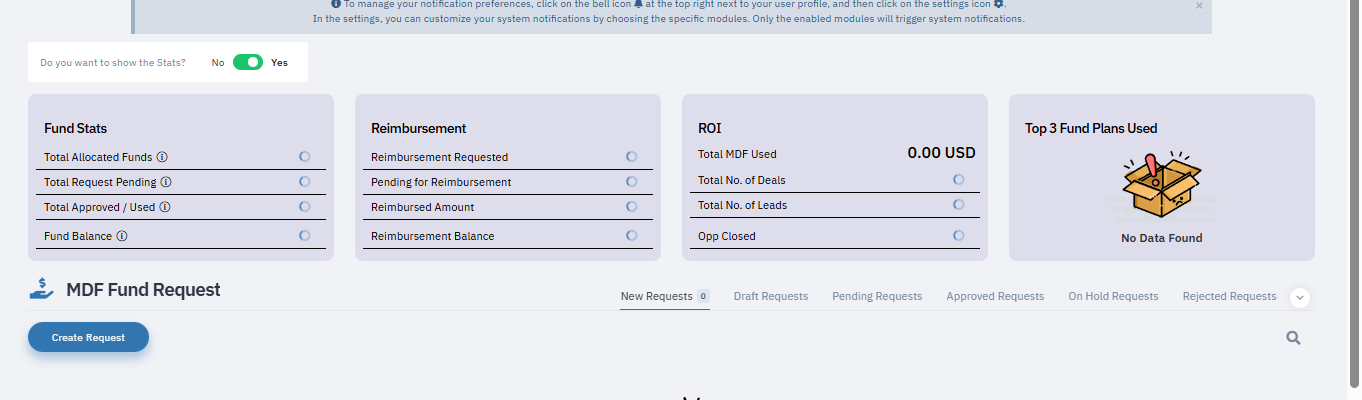 A new enhancement has been introduced to the MDF Request page that allows Super Admin users to enable and view active MDF fund statistics, providing consolidated visibility into key fund metrics for tracking allocated, requested, and reimbursed MDF funds.