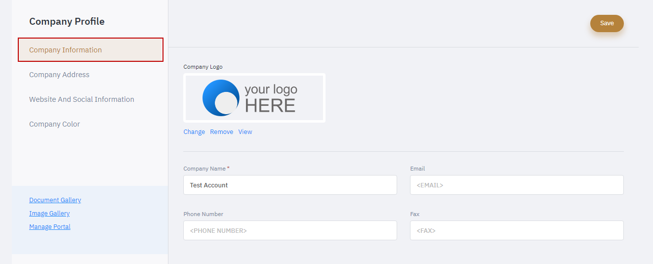 To update a Company profile, click on the underlined company name in the upper left-hand corner user profile icon. In the company profile section, you can enter in information such as your company’s name, contact info, address, or color scheme. If you personalize an asset based on company fields, the software will draw its data from these fields. Click “Save” to update your record with the changes. Click here to see how to use the Company Colors? |