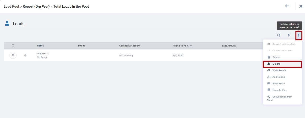3. Click on 'More' options and from the dropdown menu, select the "Report" option. This will open the report page for the selected lead pool.