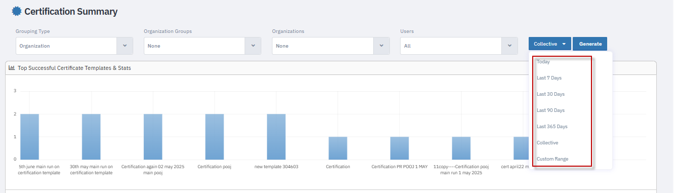 A new date range button has been added, enabling users to review certification data for predefined or custom time periods: