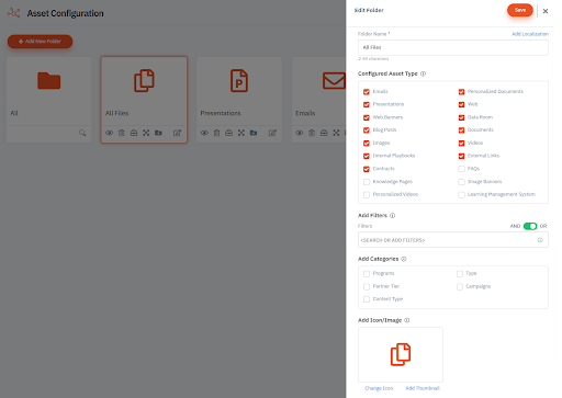 Select the asset type that should appear in the folder. This asset type is based on how the content is created in the portal. For example, Web refers to landing pages and Personalized Documents are print templates.