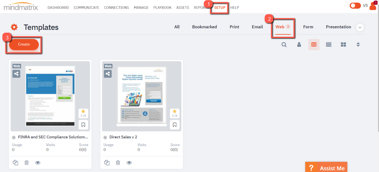In order to use a landing page, you need to publish the landing page template into "Output" mode. You can learn more about using landing pages in Output mode here: How do I use landing pages? 1. To create a landing page, you will need to utilize a web template. First go to Setup, Asset Management, and Templates. Select the "Web" tab and click "Create"