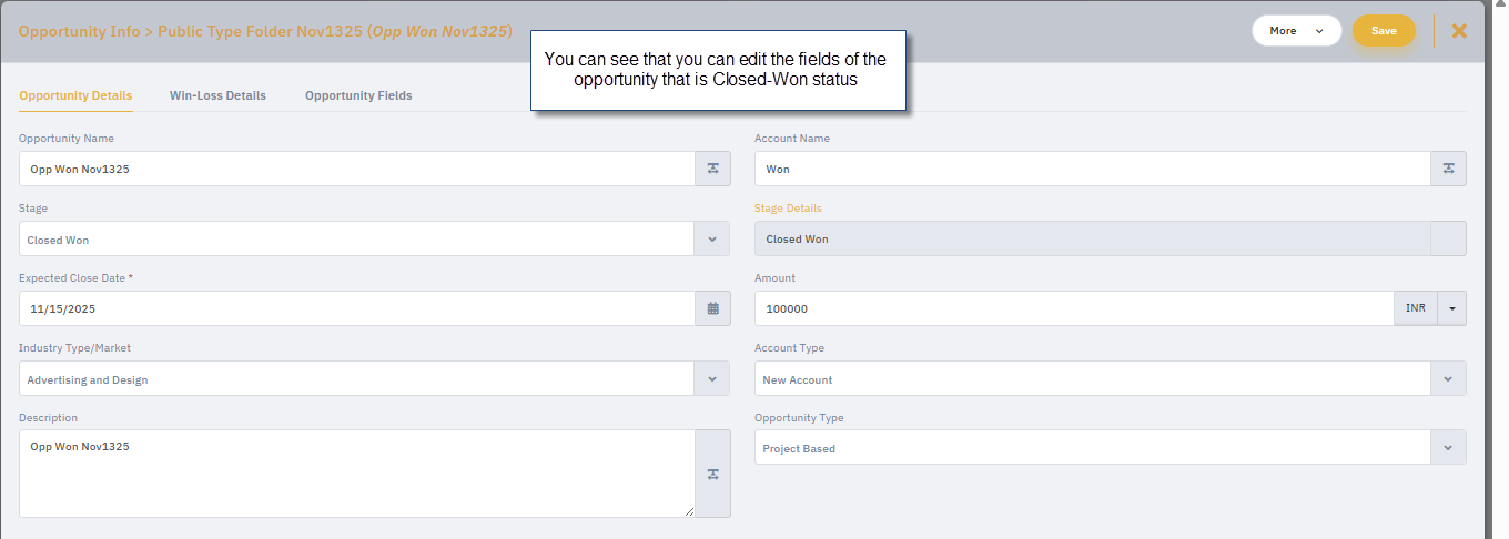 A new enhancement has been introduced in the Opportunities module that allows specific authorized users to edit opportunities even after they have been marked as Closed-Won or Closed-Lost, providing greater flexibility for data accuracy and record correction.
