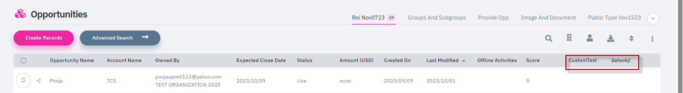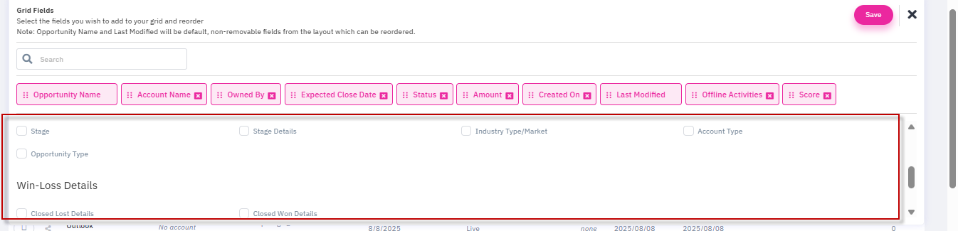 Custom Field Addition: Super Admin users can now add custom fields (configured in the opportunity layout) as grid columns on the Opportunities page. Once fields are added, click the Save button to apply changes to the opportunity page.
