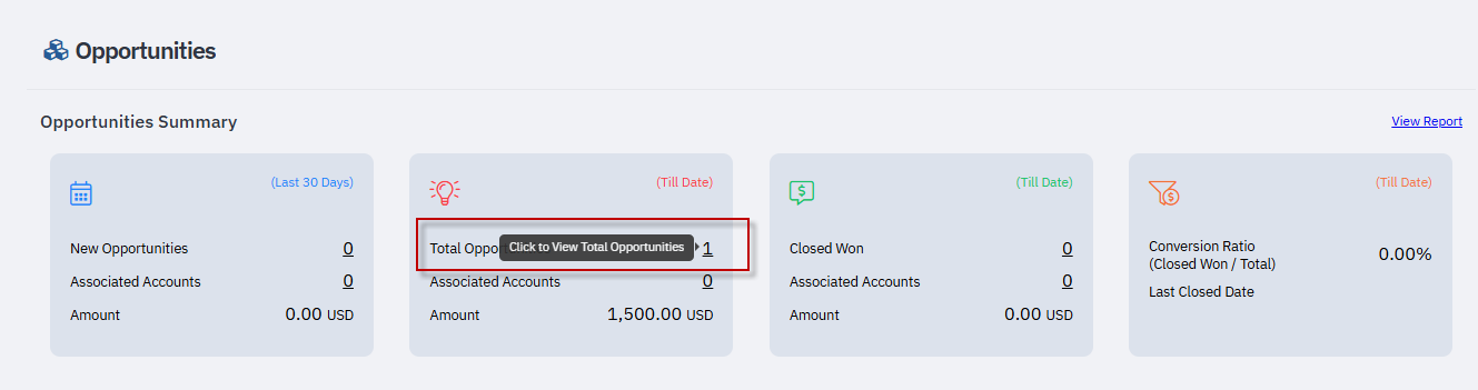 Previously, users could only view summary data on the Stats Cards at the top of the Opportunity page without the ability to explore detailed insights behind the metrics. With this update, the Stats Cards have become interactive, allowing users to click on each card to view the corresponding detailed information related to that specific metric.