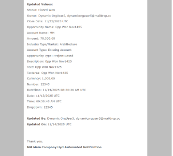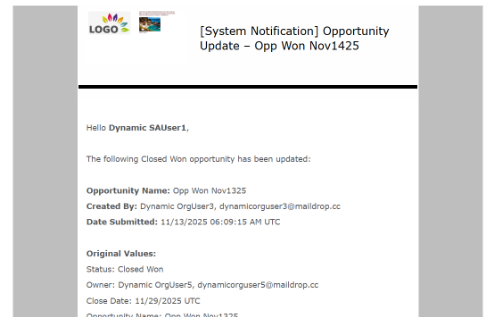 Automated Notification System: After any update is made to a closed opportunity, the system automatically sends email notifications to relevant users. The notification email includes: