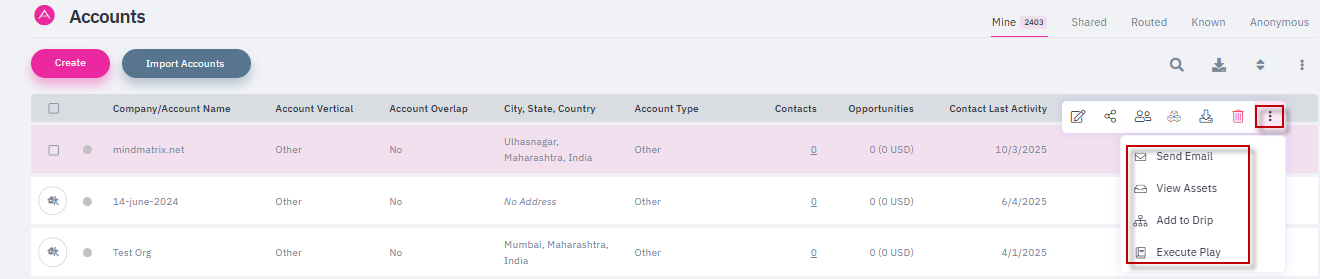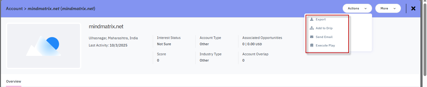 Add to Drip: Include selected contacts in automated drip campaigns directly from the account view. Users can choose appropriate drip campaigns and add single or multiple contacts, enabling efficient nurturing and engagement without navigating to separate campaign management interfaces.