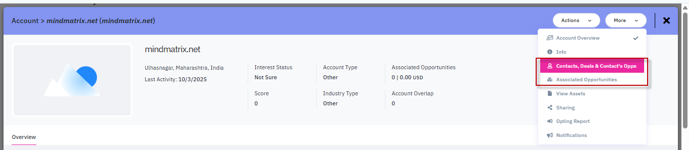 Direct Data Access: Users can view and manage associated contacts, deals, and opportunities directly from the account overview without navigating away from the page. This integrated approach provides: