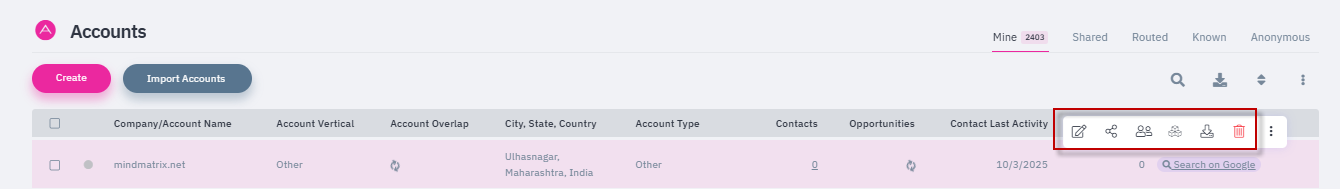 Contacts and Deals Management: View and manage contacts and deals associated with the account directly from the action bar. This integrated approach provides immediate visibility into account relationships and business opportunities without requiring navigation to separate modules or pages.