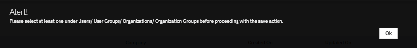 The system includes validation to ensure proper permission configuration. If an administrator attempts to save without selecting any permission options (Organization, Organization Group, User, or User Group), an alert message will be displayed prompting the user to select at least one option before proceeding.